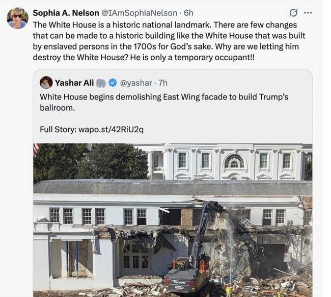 I can barely find the words after watching the East Wing of the People’s House come down. The damage goes far beyond bricks and mortar. It’s a wound to our national soul and a blow to our economy, especially in the middle of a shutdown hurting every American & our service members pic.twitter.com/sCLjalb44L
