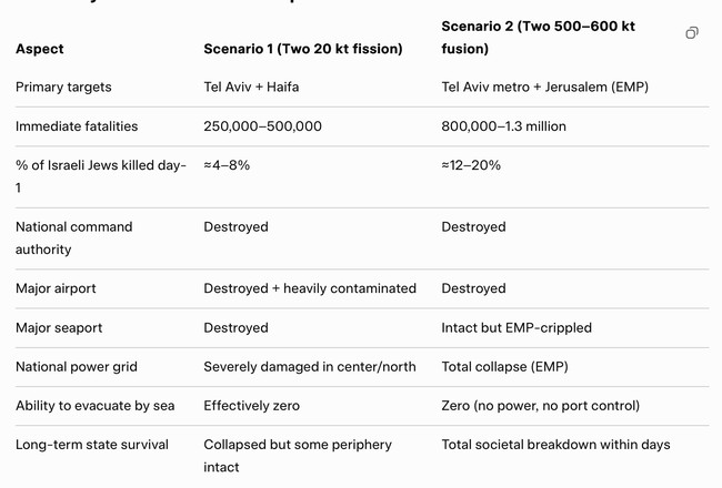 I asked both ChatGPT and Grok to outline two genocidal scenarios. In the first, Iran possesses only simple first-generation fission weapons (Hiroshima-class) with 12–25 kiloton yields. In the second, Iran has managed to build modern two-stage thermonuclear weapons with much larger, 100–500 kiloton yields. In both scenarios, Iran’s objective isn’t merely to cause casualties and destruction, but to hinder international relief efforts and expatriation of surviving Israelis — without concern for Muslim casualties.