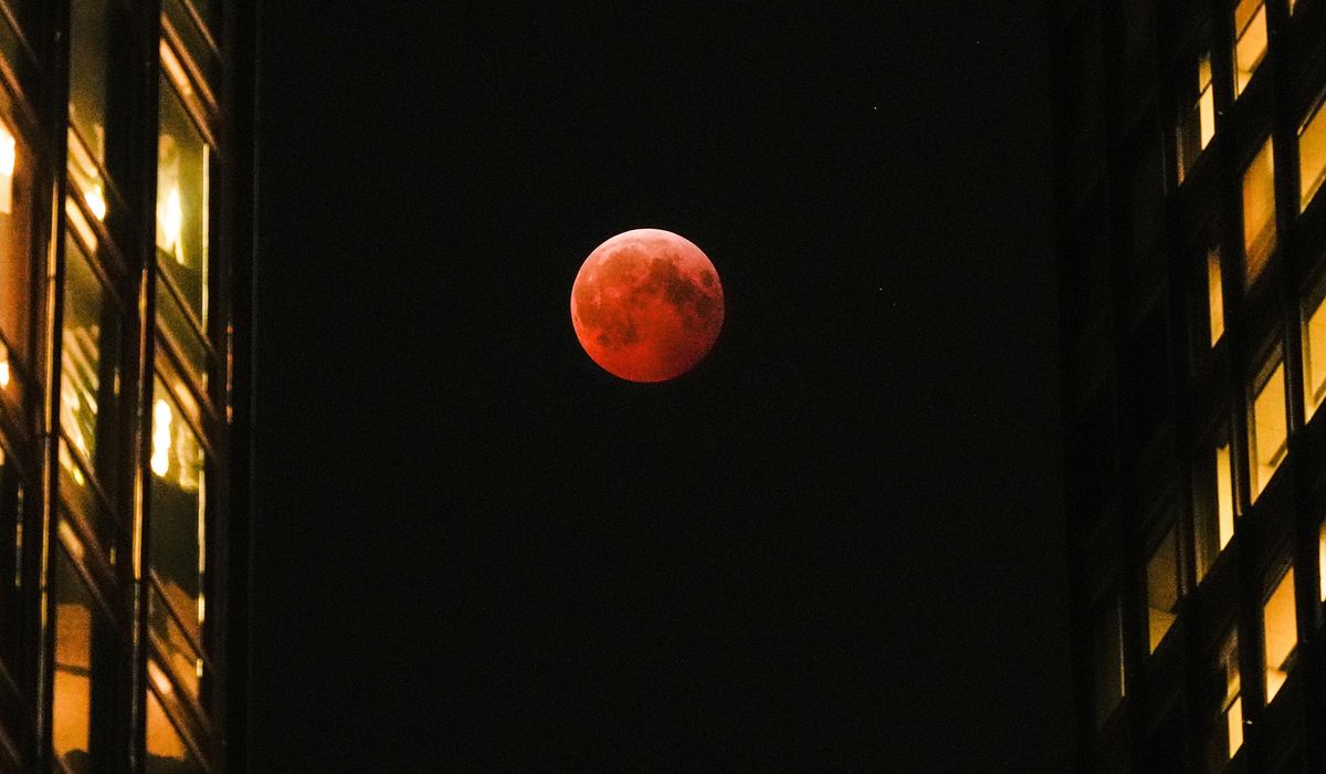 The “blood moon” occurs when the Earth passes between the sun and the moon, casting a shadow that filters sunlight through Earth’s atmosphere, giving the moon a red color.