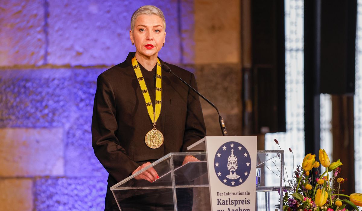 Kolesnikova was presented with the International Charlemagne Prize at a ceremony in Aachen, Germany. She won the prize in 2022, when it was received on her behalf by her sister, Tatsiana Khomich.