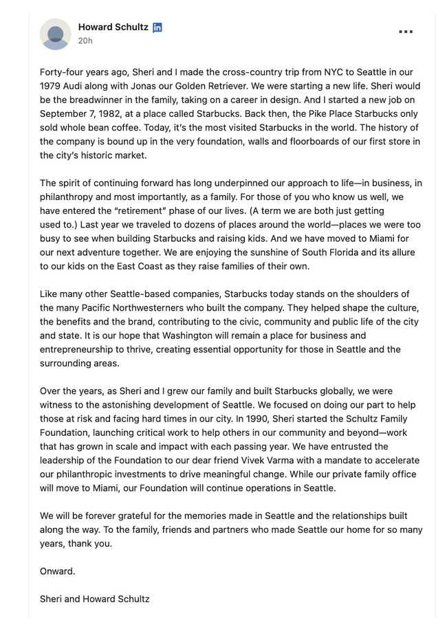 They’ve left their Schultz Family Foundation in the hands of “our dear friend Vivek Varma with a mandate to accelerate our philanthropic investments to drive meaningful change.” He added that his “private family office will move to Miami,[and] our Foundation will continue operations in Seattle.” So the Seattle charity class will still be able to wet their beaks on Howard Schultz’s largesse.