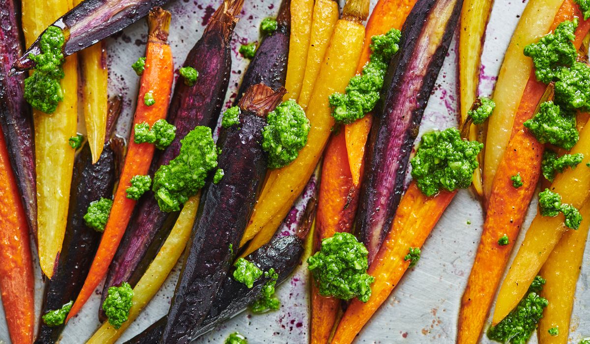 And more good news: You can make the pesto and hold it in the fridge for up to five days, plus you could get those carrots sliced a few days ahead of time, so the day you plan to serve them it’s just a question of roasting and dolloping. You can store leftover pesto in the freezer for up to two months (ice cube trays are a good little hack for this, as that allows you to defrost just what you need going forward).