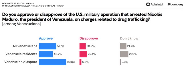 Even within Venezuela proper, excluding Venezuelans who have fled (which is about 25% of the country!), only 25% disapprove of the military operation. About half the people there outright approve of the capture or are indifferent enough to have no opinion.