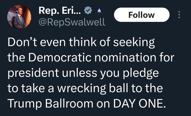 Swalwell’s demand that presidential candidates promise to tear down the ballroom on “Day 1” is a perfect example of Democratic priorities in the 21st century. Their feelings are hurt, and they want to throw a tantrum.
