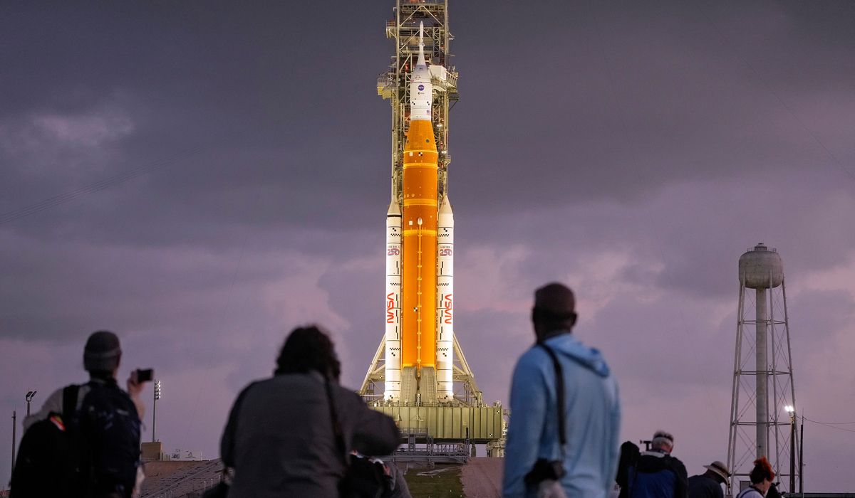 NASA’s new Space Launch System rocket stands 322 feet (98 meters), shorter than the Apollo program’s Saturn V rocket but more powerful at liftoff thanks to a pair of strap-on boosters. Atop the rocket is the Orion capsule carrying the astronauts.