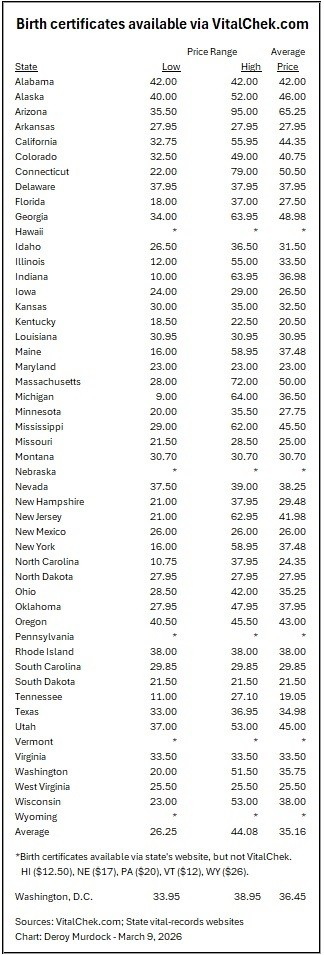 VitalChek’s prices average $35.16, ranging from as little as Michigan’s $9.00 to as much as Arizona’s $95. (The five non-VitalChek states charge from Vermont’s $12 to Wyoming’s $26.) Shipping is extra. Documents arrive directly from relevant government agencies.