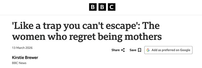 March 2026 has been a banner time for regretful parent stories, while the DINK propaganda period was last year, apparently. It makes you wonder whether is this hive mind behavior, or coordinated consciously.
