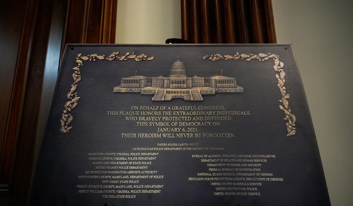“On behalf of a grateful Congress, this plaque honors the extraordinary individuals who bravely protected and defended this symbol of democracy on Jan. 6, 2021,” reads the faux bronze stand-in for the real thing. “Their heroism will never be forgotten.”