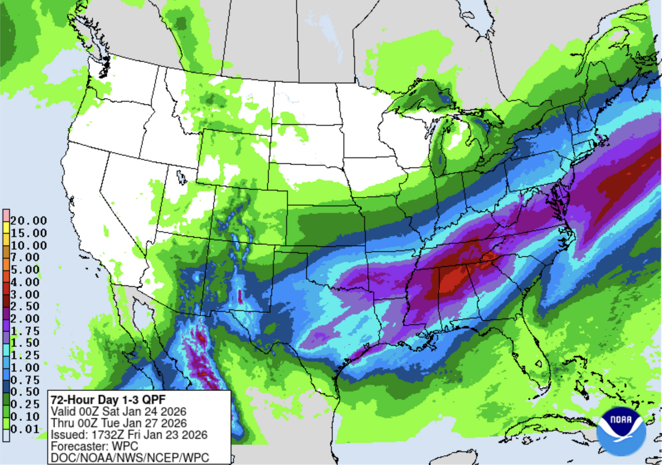 The weather setup involves a collision of Arctic air masses and low-pressure systems. A strong Arctic front pushed through Friday night, with high pressure moving southward from Central Canada ushering in bitterly cold temperatures. Meanwhile, low pressure over the Gulf Coast is expected to spawn a second system that will track northeastward along the Southeast and Mid-Atlantic Coast through Sunday, producing what the National Weather Service describes as a “significant, long-duration winter storm.”